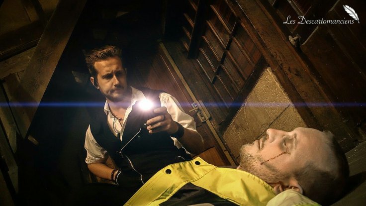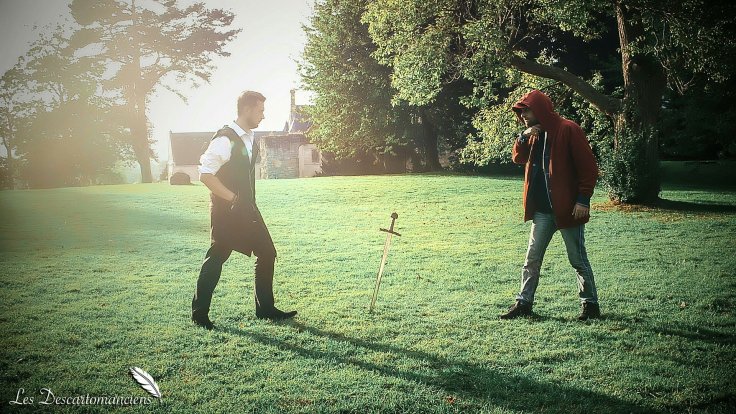 (Julien , à gauche, dans son rôle de Dante pour les descartomanciens)