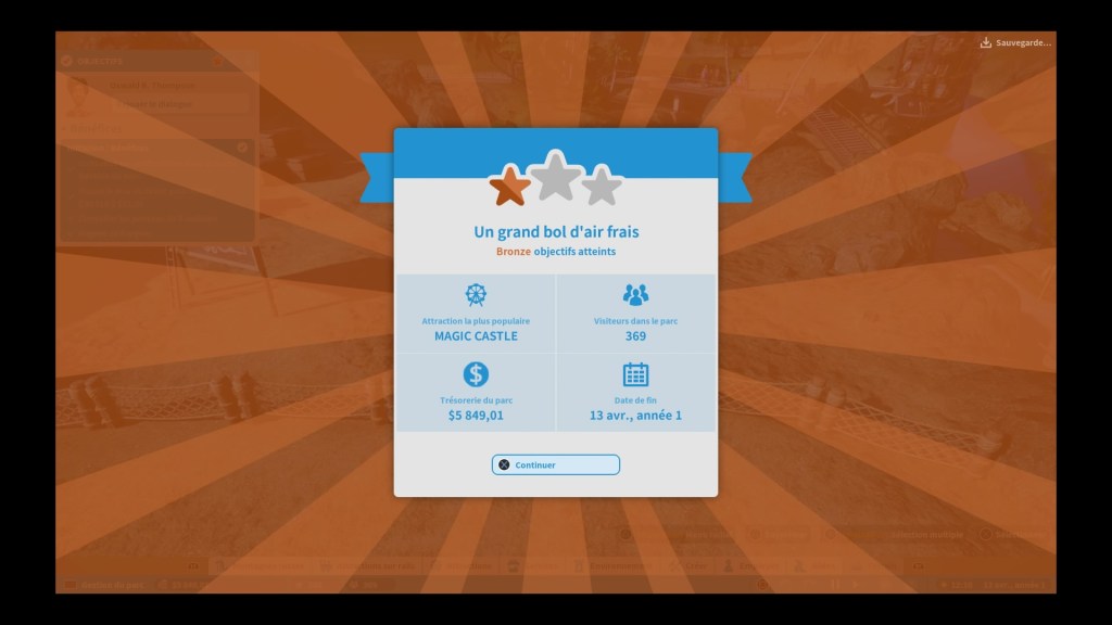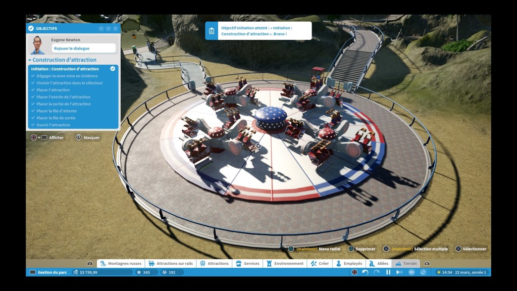 Comme pour tout jeu de simulation qui se respecte, il y aura des taches à accomplir pour que notre parc soit le plus parfait possible. Ici, si l’on suit la trame du jeu, nous aurons droit à un système d’étoiles qui nous permettra d’évaluer notre potentiel. Aller chercher les trois étoiles ne sera pas toujours évident, à l’instar des tickets d’Or lorsque nous étions jeunes et beaux sur Theme Parc World, mais c’est une certaine source de motivation je dois dire ! Pour ma part, je me sens toujours satisfait et plein de gratitude envers moi-même quand j’arrive à accomplir les missions proposées et avoir les trois étoiles, je me dis que j’ai abouti sur quelque chose de beau et que le potentiel est là. Et non, j’ai pas la grosse tête, je suis juste réaliste. Mais pour parvenir à ces trois étoiles, il faudra une gestion impeccable et implacable, dont nous allons parler des à présent.