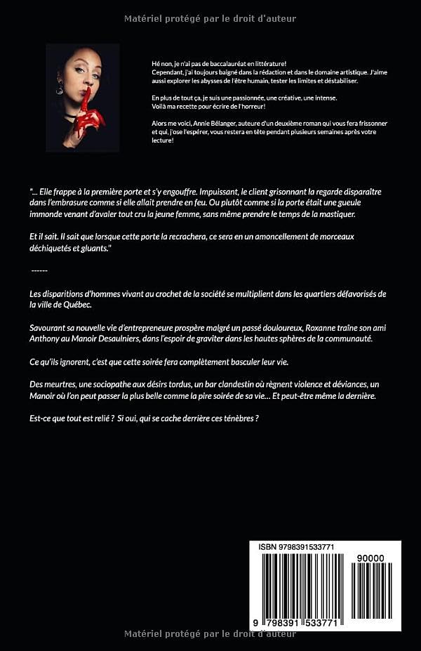 Des meurtres, une sociopathe aux désirs tordus, un bar clandestin où règnent violence et déviances, un Manoir dans lequel on peut passer la plus belle comme la pire soirée de sa vie… Et peut-être même la dernière.